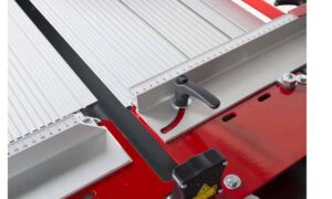 En este caso la plataforma de corte es una mesa y la punta se sustituye por una sierra especial para cerámica. Para que el corte sea preciso estas máquinas suelen llevar punteros láser que marcan la zona por la que tiene que pasar la sierra.